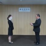 体温測定を行った後、当社が用意したマスクを配布し、手指をソリューションウォーターで(弱酸性次亜塩素酸水溶液)