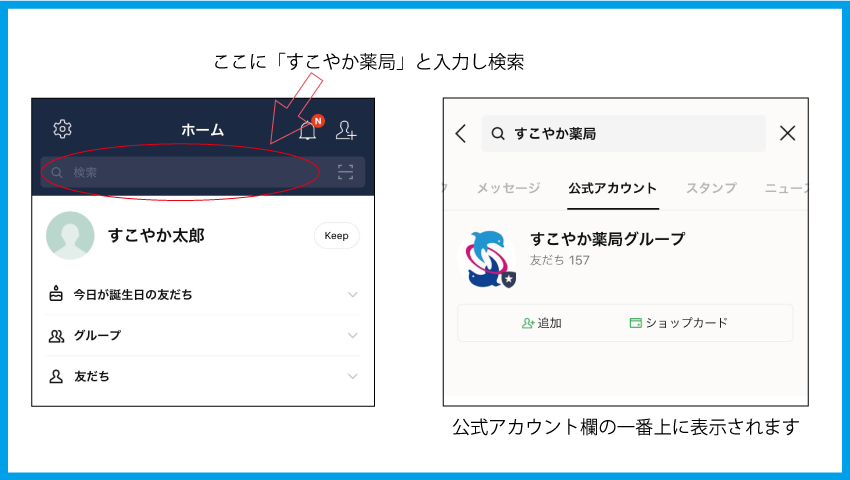 お友だち追加はLINE内で「すこやか薬局」と検索、またはこちらをクリック・タップ!